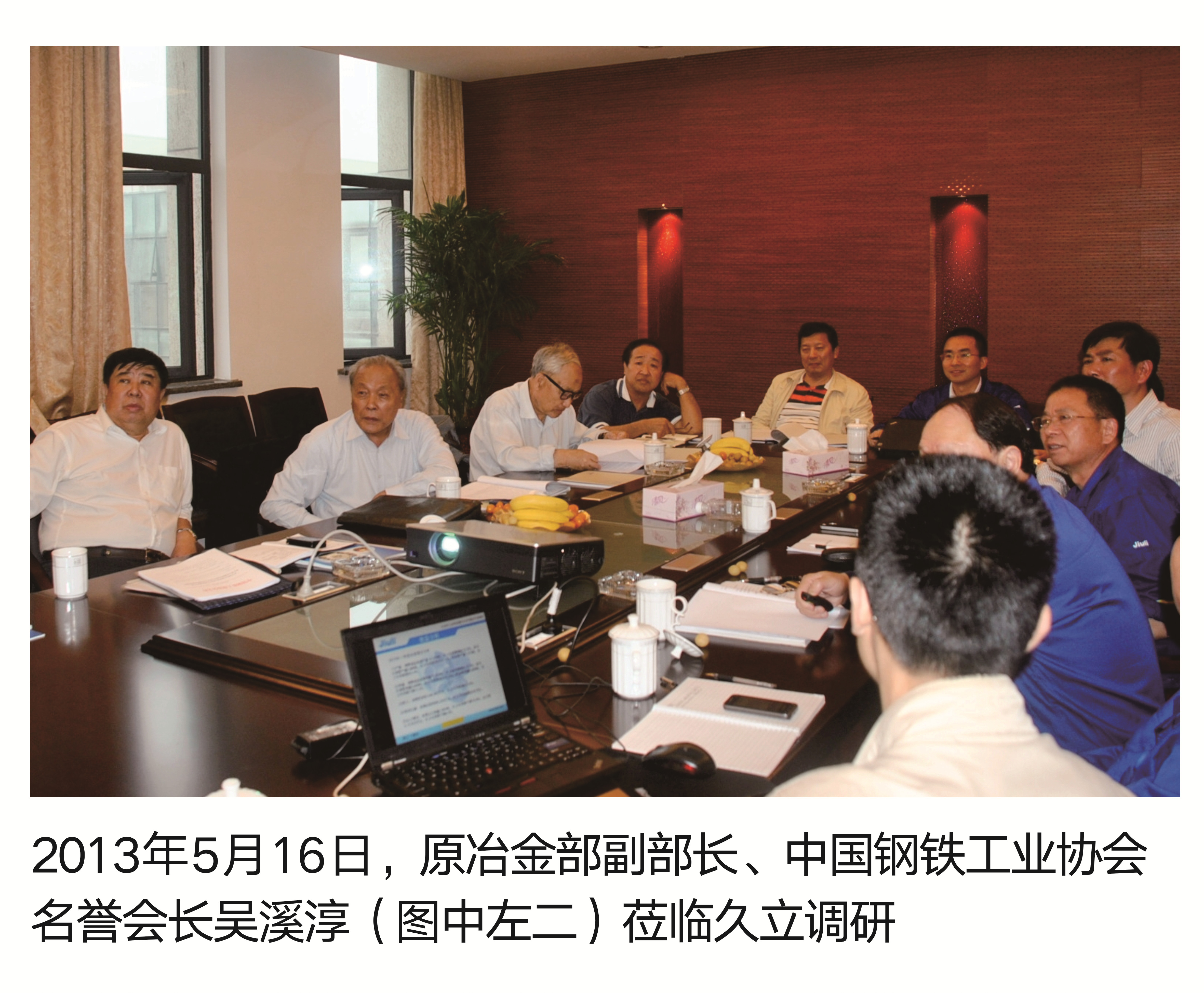 2013那年5月16日,原冶金部副部长、中国钢铁工业协会信用会长吴溪淳(图中左二)莅临js1996调研